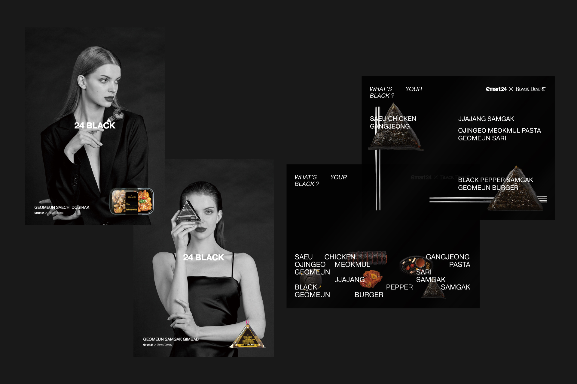 검은사막 게임의 세계관을 모티프로 연출된 emart24의 럭셔리 에디션 팝업스토어 24BLACK의 공간 내 그래픽 디자인을 진행했다. 블랙을 주제로 한 음식 이미지와 위트있는 문구를 심플하게 배치하여 고급스러운 무드를 드러내고자 하였다.